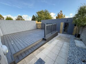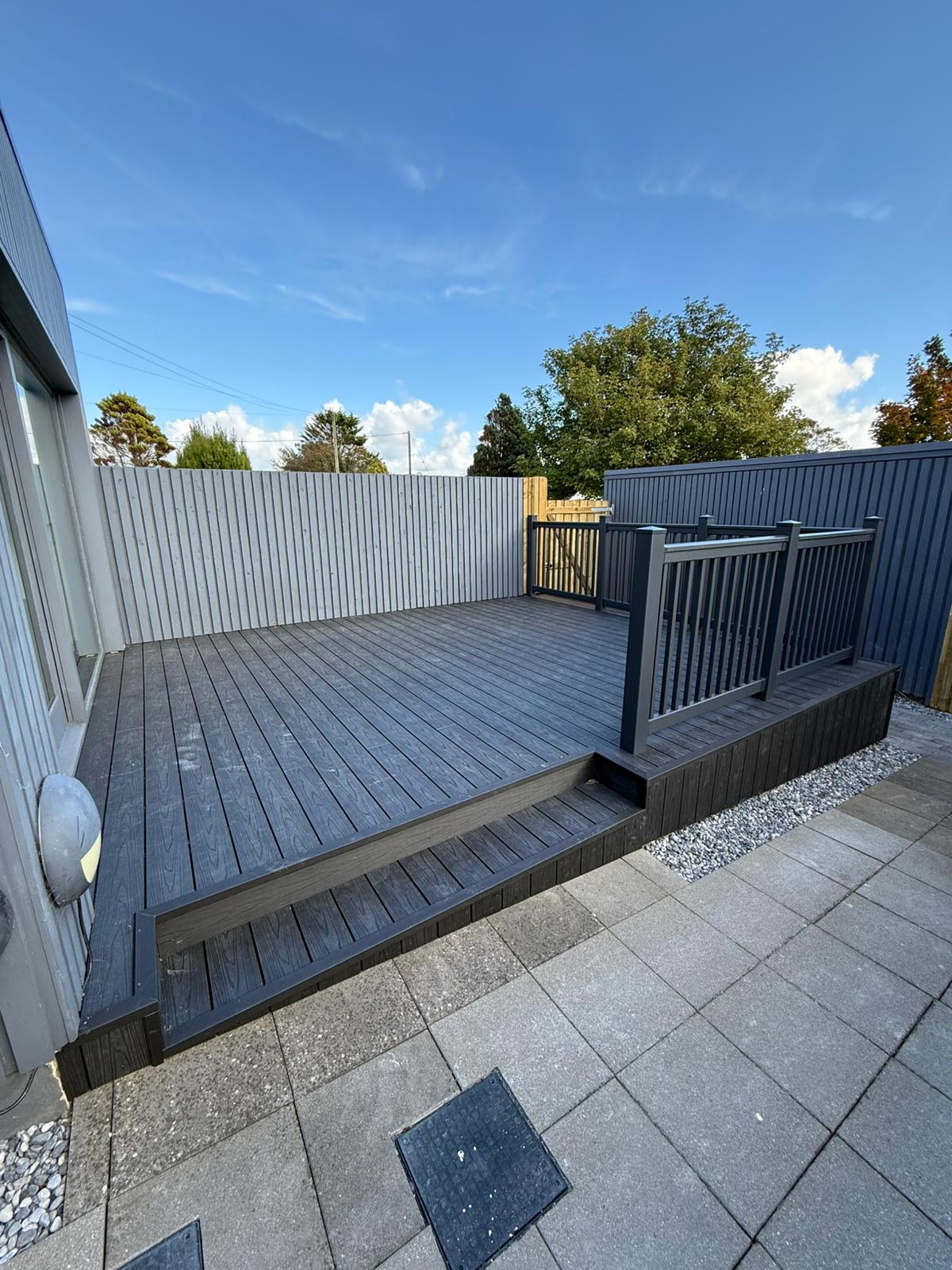 The design evolved in collaboration with the client as the project progressed. We selected hard-wearing smooth paving and composite decking to ensure longevity, with high-contrast borders for a refined finish. Throughout, we focused on details such as proper drainage to eliminate surface water, ensuring long-term performance as well as aesthetics.